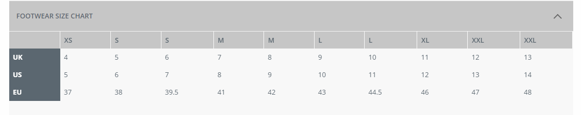| EU | 37 | 38 | 39.5 | 41 | 42 | 43 | 44.5 | 46 | 47 | 48 |